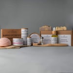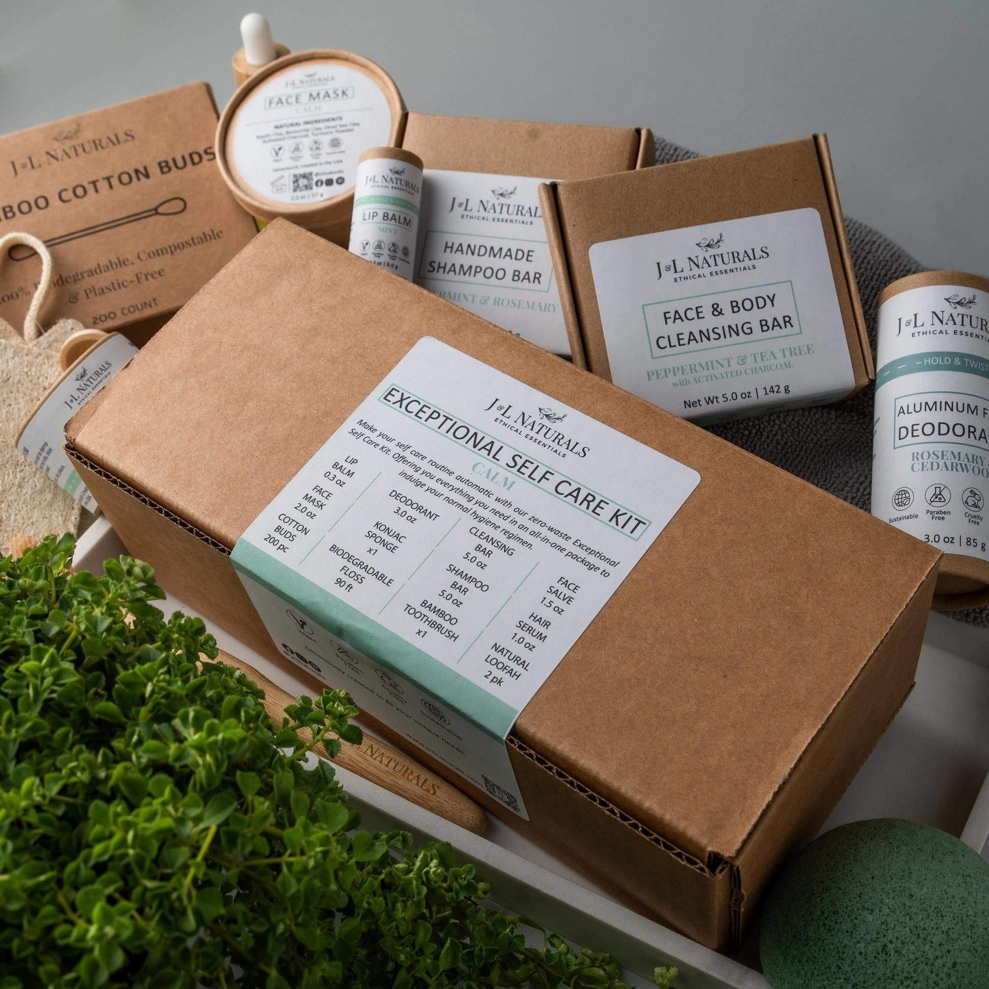 Includes: (1) Cleansing Bar, (1) Konjac Sponge, (1) Face Mask, (1) Face Salve, (1) Lip Balm, (1) Shampoo Bar, (1) Hair Serum, (1) Deodorant, (1) Bamboo Toothbrush, (1) Floss Kit, (1) Loofah Pad, (1) Box of Cotton Buds