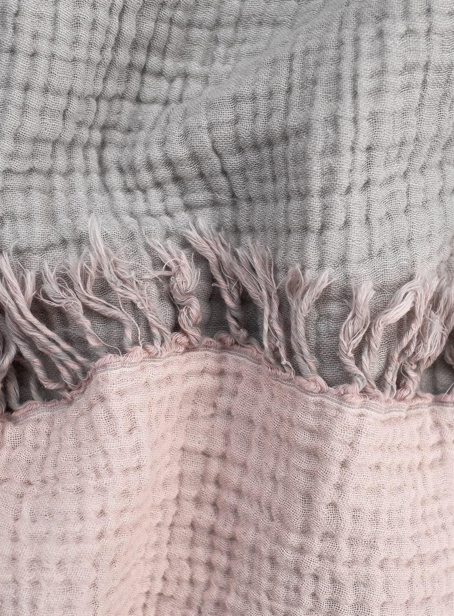Powder Pink Grey is one of the favorite pieces of the Warm theme. This product with a size of 130x170cm, made of 100% cotton, is calm enough to adapt to any product and color. The product can be used double-sided. The front is gray and the back is powder pink.Haze Throw is a candidate to be a soft nuance in your home. Produced with 100% cotton weaving technique, this product can be used double-sided. It can be used as a TV blanket, seat cover and for decorative purposes. It is 130x170cm in size.It is soft to touch, perfect for wrapping yourself up on the couch, in your bed, or even at the beach for a picnic! - Can even work great as a towel after swimming on the lake.Fine Cotton - multiple layers of cotton mesh fabric. The open weave and lightweight cotton fabric allows the airflow. This breathability feels nice on your skin and gives you peace of mind.SUSTAINABILITYOeko-Tex certificatedDESCRIPTION100% Cotton130x170 cm