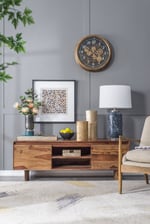 Contrasted off the neutral linen shade, the blue glass base of the lamp, bring cools tones to any seaside or modern living space.