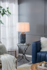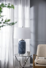 Placed on your coastal inspired table, the Ellis Glass Table Lamp adds strong colors to the room. Contrasted off the neutral linen shade, the blue glass base of the lamp, bring cools tones to any seaside or modern living space.