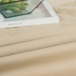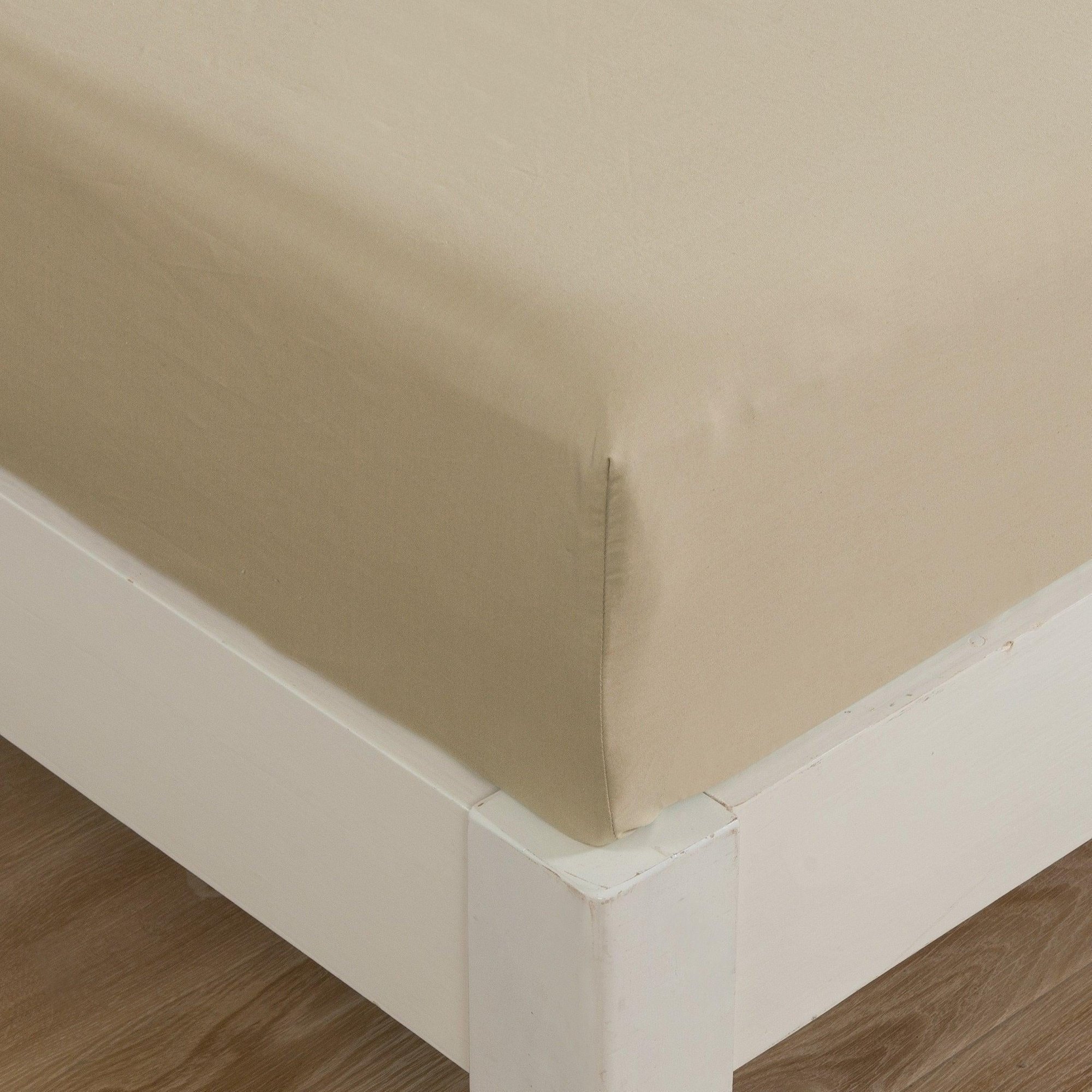 This fitted sheet set is a solid neutral beige tan sand shade with a 14” standard pocket in this modern yet