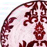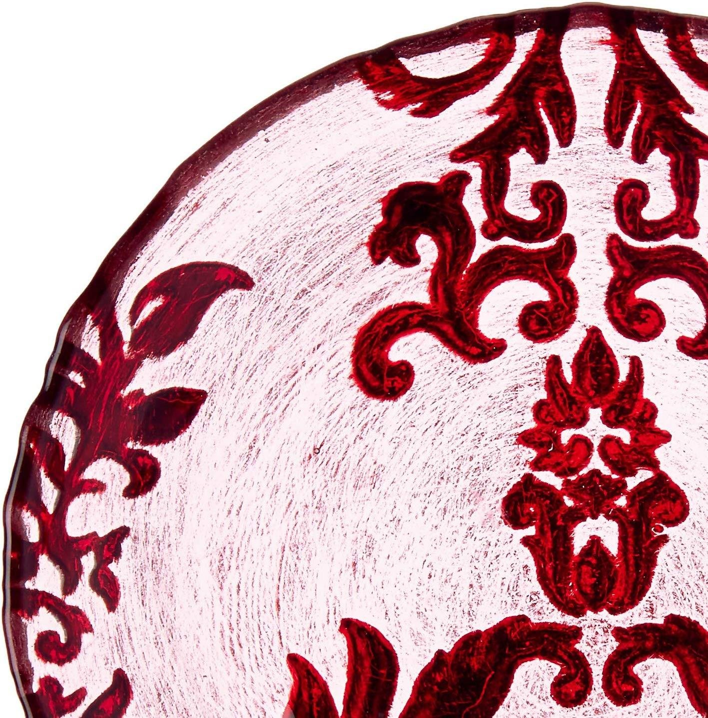 Dating back to the Byzantine period DAMASK is a style of weaving is reversible patterns on fabric. This pattern is brought to you in several colors on this 6.5" sized canapé plate to fit all table settings at your most exclusive dinner parties or to enhance the beauty of your home design.Each piece is hand made using spun glass technique, once the glass has cooled down we hand decorate each one on the back of the glass starting with a hand applied patina paint which follows with gilding the silver, gold or copper leaves on the surface. Once the surface is cleaned from metal leaf residues, the item is heat cured we then layer organic pigment in steps to each glass piece by hand. As the metal layer soaks the paints in, all items are sealed with a special lacquer to assure its resistance to usage and heated for a final time to cure the item and penetrate all materials on the glass surface. Start to finish each one takes up to 3 hours to create.You can use this piece of art plate as a decor piece on your coffee table, coin plate, jewellery plate or even a soap dish in your bath. You can also serve food as soup, salad, dessert, appetizers, cheese