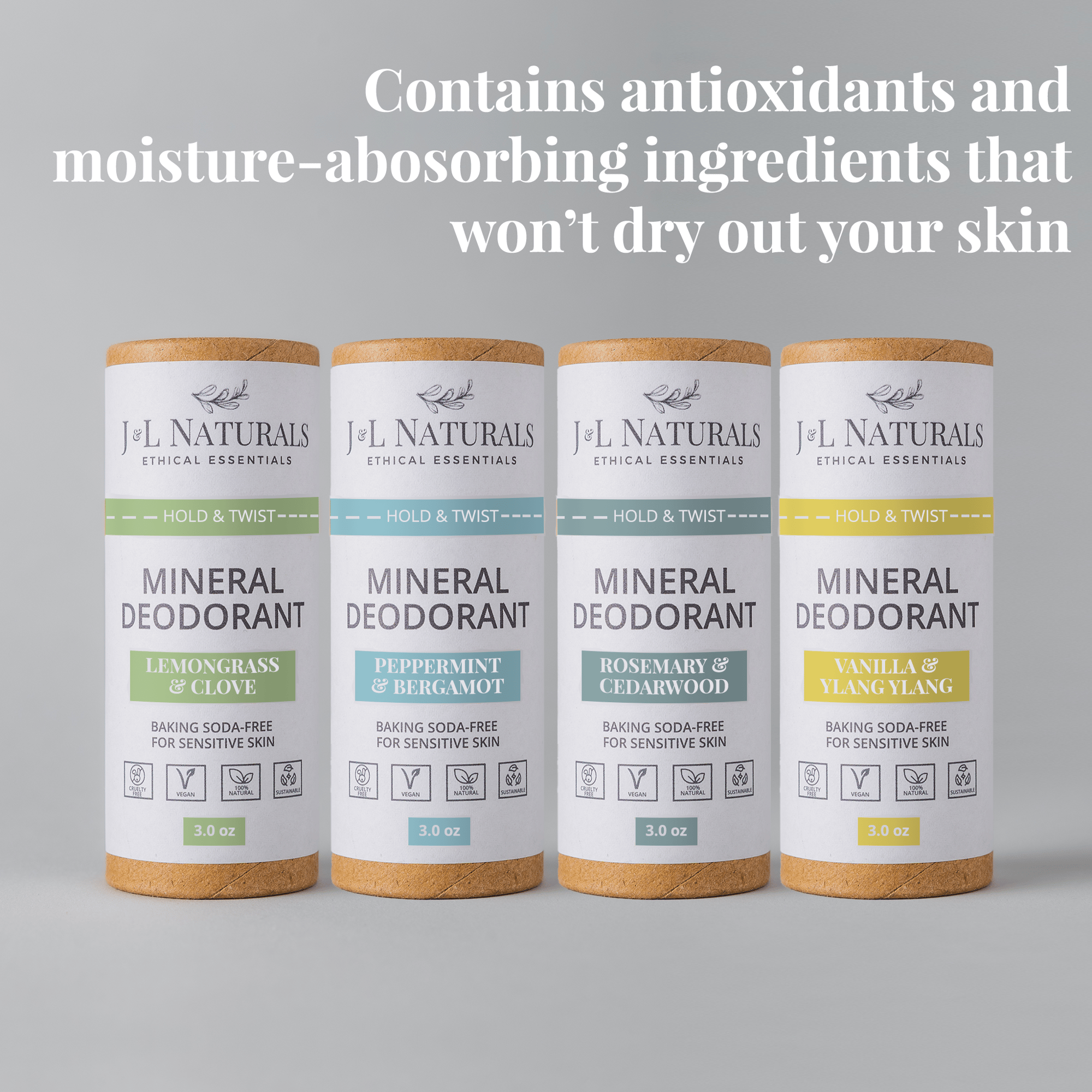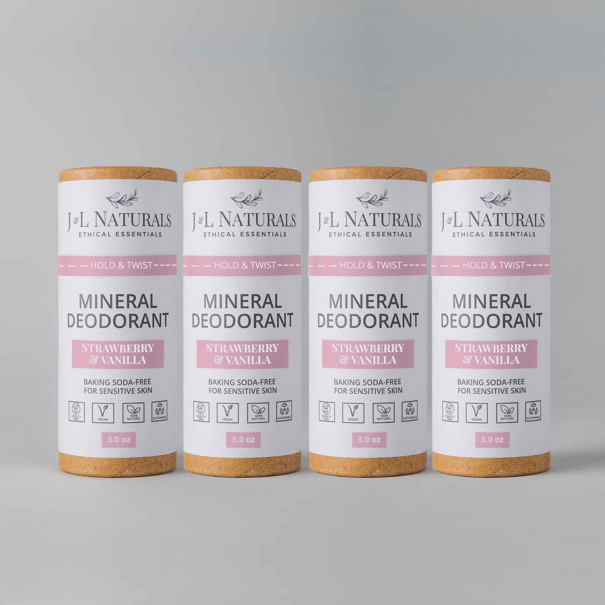 Wherever you go, feel confident knowing your deodorant has you covered. This Mineral Deodorant glides on smoothly, while effectively killing bacteria, preventing body odor, and allowing you to sweat naturally. It is baking soda-free and suitable for extra sensitive skin. No harsh, stinging feeling, irritation, or synthetic-smelling fragrances.Choose between Bergamot & Vanilla, Lemongrass & Clove, Orange & Bergamot, Strawberry & Vanilla, Peppermint & Bergamot, Rosemary & Cedarwood, Vanilla & Ylang Ylang, Activated Charcoal, and Naked (unscented).Includes: (4) Mineral Deodorants